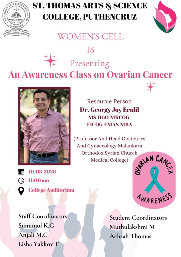 In connection with International Women’s Day, the Women’s Cell of St. Thomas Arts & Science College organized an awareness class on ovarian cancer on 10 March 2026 at 11:00 AM in the College Auditorium. The session was handled by Dr. Georgy Joy Eralil, Professor and Head of the Department of Obstetrics and Gynaecology at MOSC Medical College, who served as the resource person. The program aimed to create awareness among students about the symptoms, risk factors, prevention, and the importance of early detection of ovarian cancer. The session was highly informative and encouraged students to be more conscious about women’s health and well-being.