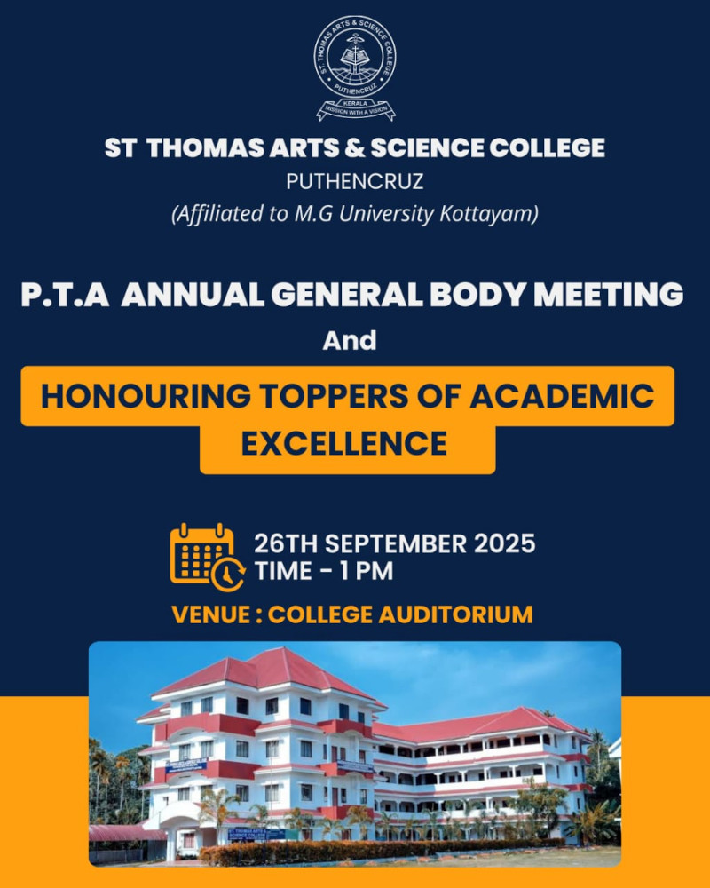 പുത്തൻകുരിശ് സെന്റ് തോമസ് കോളേജിലെ 2025.-26 അധ്യയന വർഷത്തെ അധ്യാപക രക്ഷകർത്തൃസംഘടനയുടെ വാർഷിക പൊതുയോഗം പ്രിൻസിപ്പൽ ഡോ.എം.എ.റെജി ഉദ്ഘാടനം ചെയ്തു. പി.ടി.എ.സെക്രട്ടറി കൊമേഴ്സ് വിഭാഗം അസി.പ്രൊഫ.ഷെനിയ പി.മാത്യു വാർഷികറിപ്പോർട്ട് അവതരിപ്പിച്ചു.പി.ടി.എ.വൈസ് പ്രസിഡൻ്റ് ബീന കുഞ്ഞുമോൻ,ഐ.ക്യൂ.എ.സി. കോർഡിനേറ്റർ ഫാ.ഹെനു തമ്പി,കൊമേഴ്സ് വിഭാഗം മേധാവി കെ.വി.രേഖ,പി. ടി. എ.എക്സിക്യൂട്ടീവ് മെമ്പർ ദിവ്യ ജോൺ എന്നിവർ സന്നിഹിതരായിരുന്നു.കലാലയത്തിൽ ഉന്നതവിജയം നേടിയ വിദ്യാർത്ഥികൾക്ക് പുരസ്കാരവും ക്യാഷ് അവാർഡും വിതരണം ചെയ്തു.എയ്സൻ ഫിലിപ്പ് മെമ്മോറിയൽ അവാർഡ് ബിരുദാനന്തര ബിരുദ വിദ്യാർത്ഥിനിയായിരുന്ന അനഘനാരായണൻ ഏറ്റുവാങ്ങി.